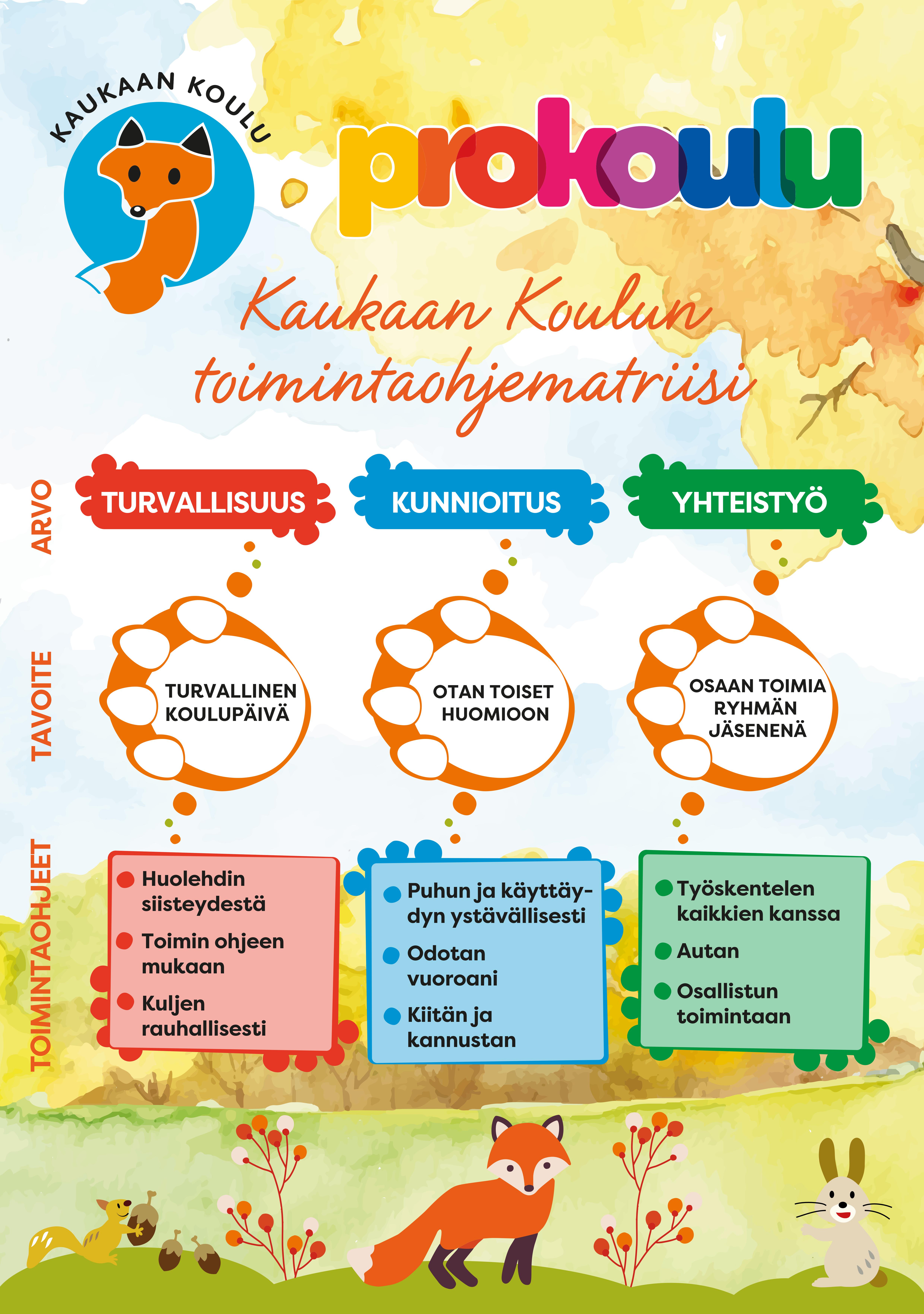 Kaukaan koulu on Prokoulu, jossa toimintaa ohjaa ProKoulu-toimintamatriisi. Prokoulu on tutkimustietoon perustuva hyvään vuorovaikutukseen kasvattava koko koulun yhteinen toimintamalli, jolla ennaltaehkäistään käyttäytymisen ongelmia. Kaukaan koulun toimintamatriisi on luotu yhteistyössä oppilaiden, huoltajien ja henkilökunnan kanssa. Matriisissa on kuvattu koulun arvot ja niihin sisältyvät tavoitteet:
