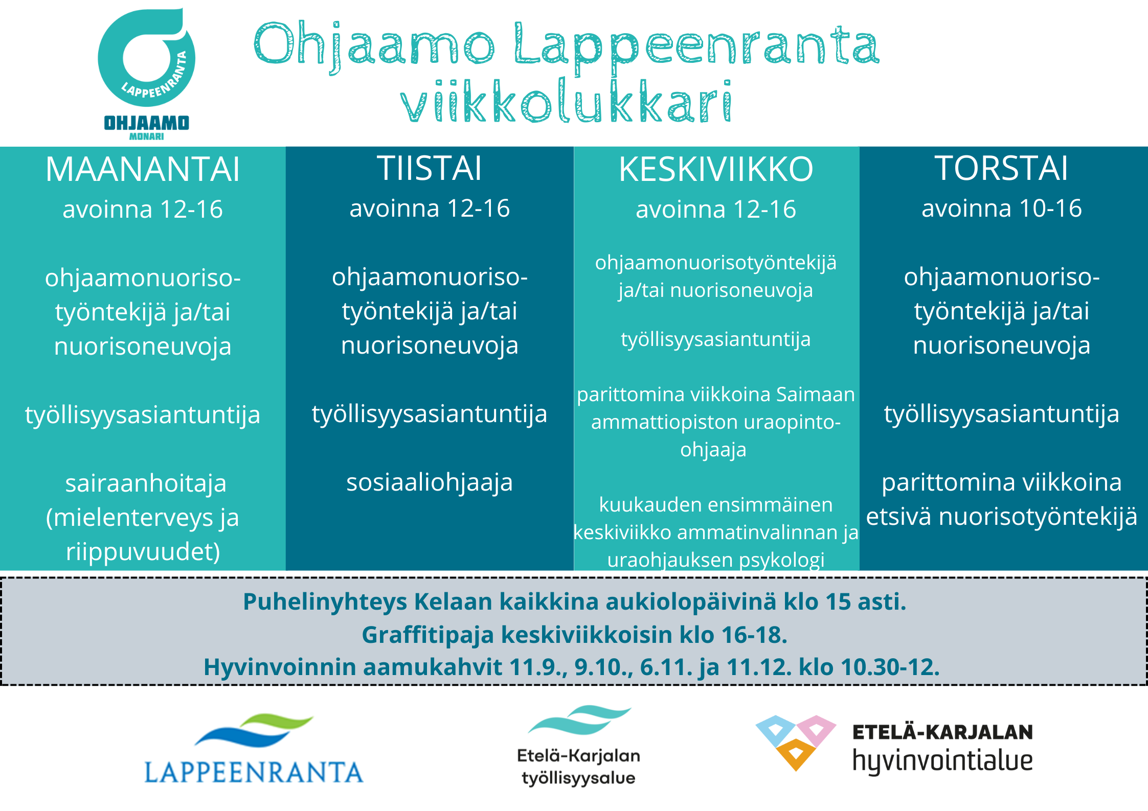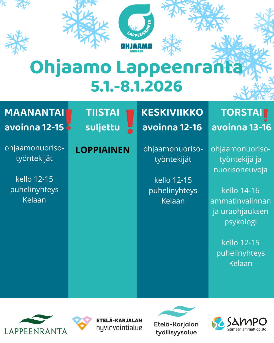 Ohjaamo Lappeenranta on kaikille alle 30-vuotiaille tarkoitettu palvelupiste, josta saat maksutonta palvelua elämässä eteen tuleviin pohdintoihin. Ohjaamossa työskentelee monien alojen asiantuntijoita, jotka auttavat sinua löytämään oikean palvelun. Oli asiasi pieni tai suuri, on Ohjaamo aina oikea paikka aloittaa. Ohjaamossa osataan auttaa ja neuvoa elämäntilanteessasi eteenpäin.