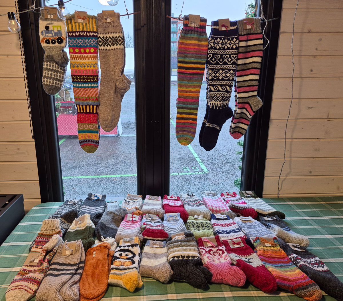 Myyntiin tulossa virkattuja mattoja, neulottuja sukkia ja lapasia. Valmistajina kolme käsityöläistä, jotka löydät Instagramista nimillä: @piipahtamassa, @neulontanalle, @villapisara