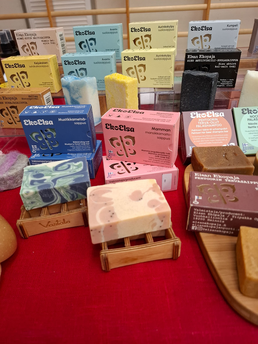 Olen Katariina Trygg, joulumökkiini tulee myyntiin käsitöitä, leivonnaisia sekä Ekoelsan ekologisia säilöntäaineettomia palasaippuoita ja -shampoota.