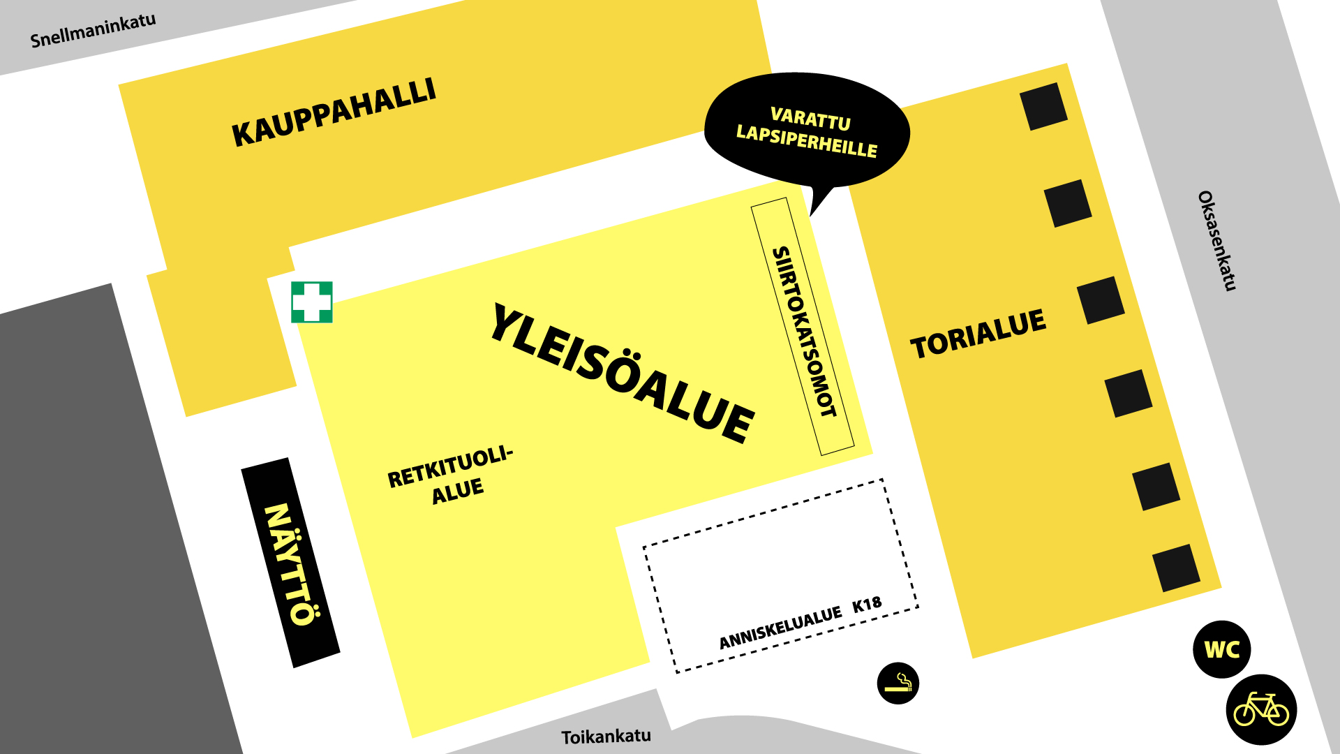 Lapsiperheille varatut katsomot ovat alueen takaosassa. Niiden takana sijaitsevat myyntipisteet sekä torialue. Näyttöön nähden vasemmalla puolella on aidattu K‑18‑anniskelualue. Muu alue on avoin kaikille. Ensiapupiste on näytön oikealla puolella vihreässä teltassa, kauppahallin seinustalla.