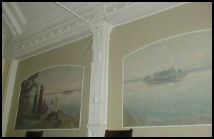 Juhlasalin pilasteri ja A. Kamppurin pannoo -maalauksia, joita on kaikkiaan 6 kpl. Taideteos tuli koululle 1913.