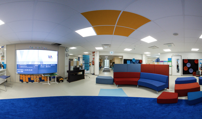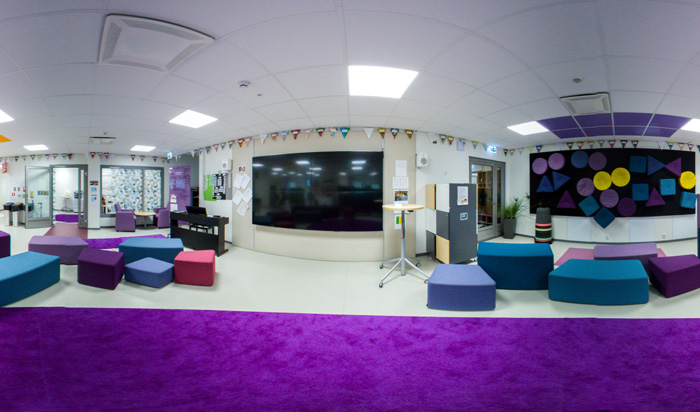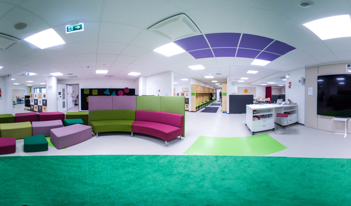 The pod includes four learning spaces similar in size to traditional classrooms and equipped for various purposes, and a central square at the middle of the pod. Each learning space opens up to this central square from one corner.