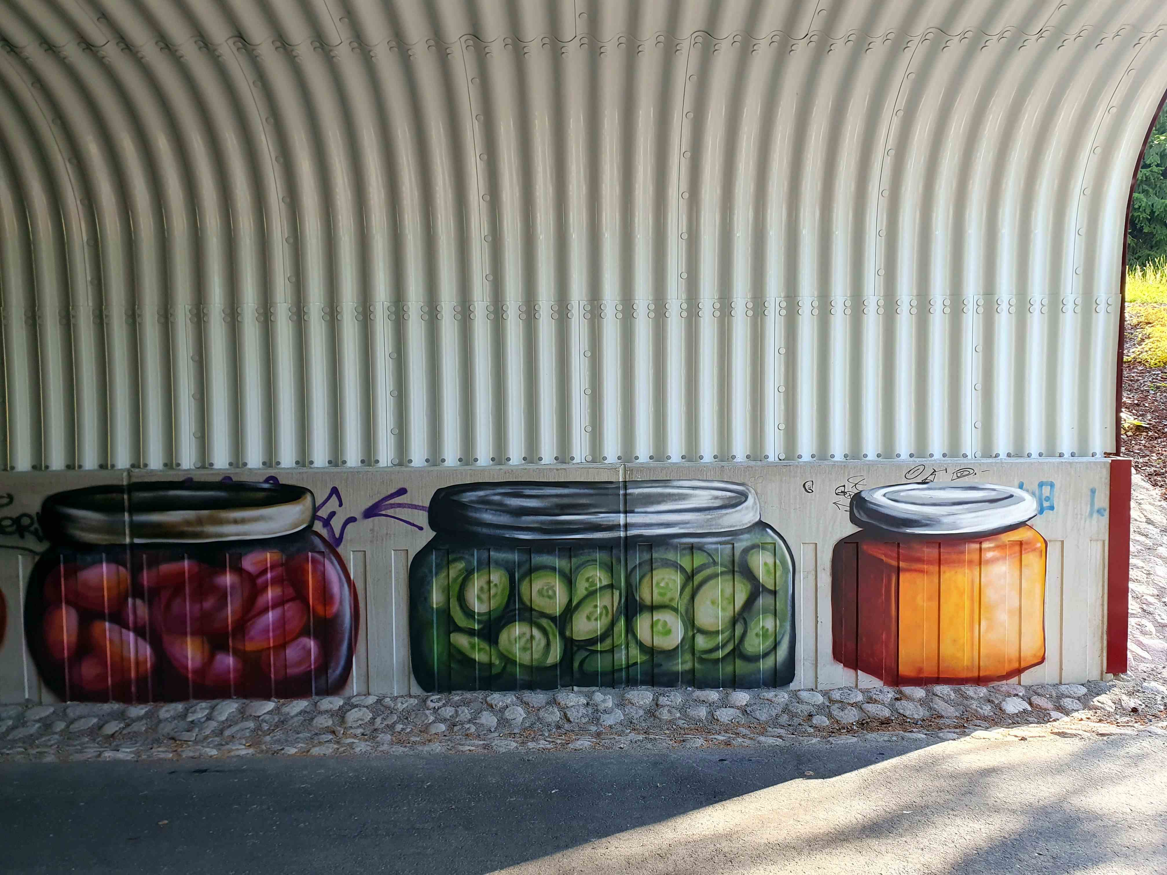 “Alikulkutunnelin muoto muistutti minua suuresta maakellarista ja päätin maalata tunnelin betoniseinille suuria säilykepurkkeja ja muuta kellarin sisältöä. Olin suunnitellut valmiiksi osan säilykkeistä ja maalatessani sain ohikulkijoilta toiveita mitä maalaisin seuraavaksi. Tein kyselyn myös omassa sekä kaupunkisuunnittelun instagramissa ja otin vastaan toiveita kellarin hyllyille maalattavista asioista. Maalasin kellarin hyllylle loppujen lopuksi mm. hilloja, säilöttyjä valkosipuleita, mehupullon, kurpitsoita, suolakurkkuja, kirsikkatomaatteja, perunoita sekä hiiren." -Senni Koskenvesa