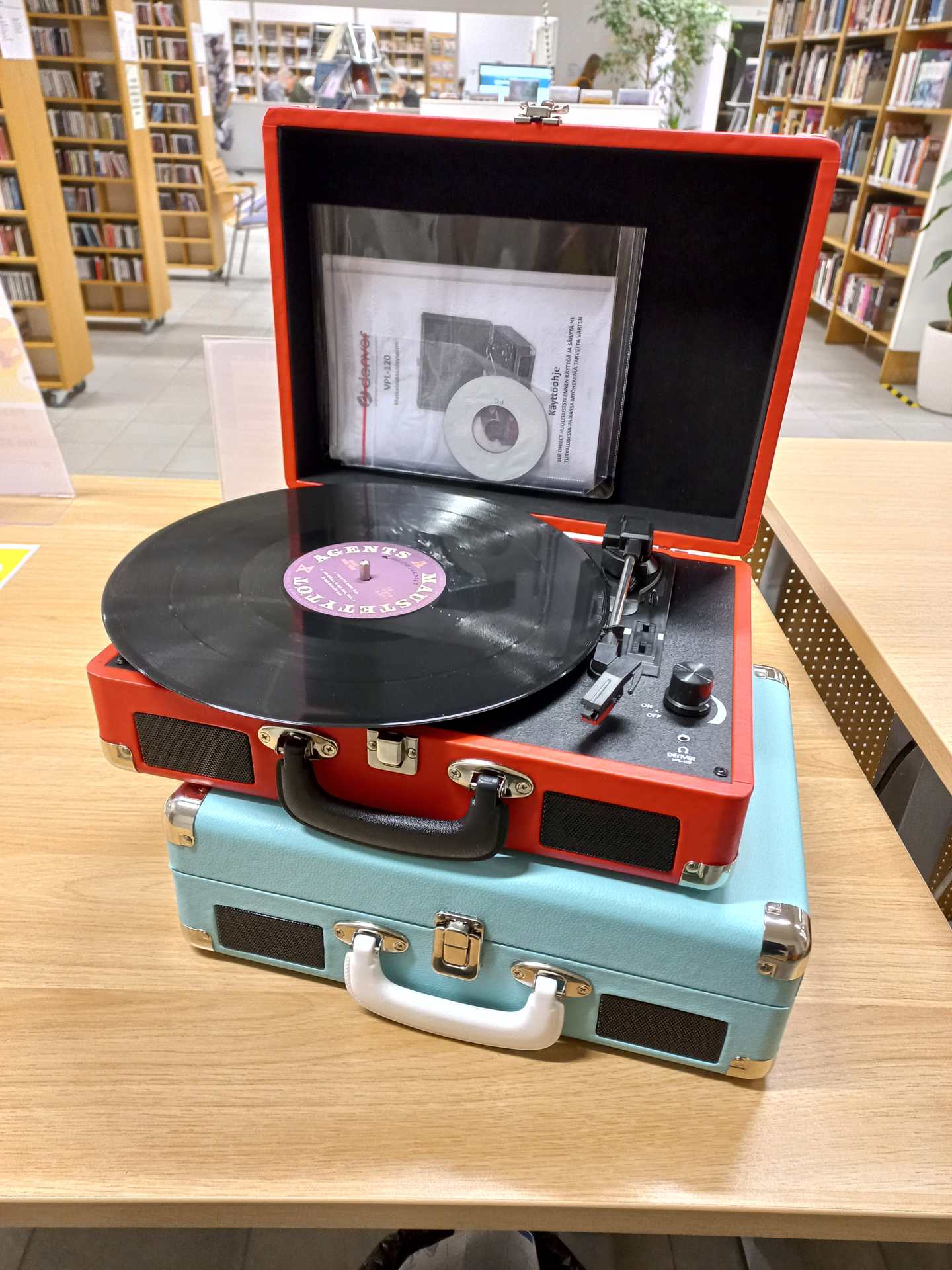 Pääkirjaston musiikkiosastolla on lainattavana kaksi kannettavaa levysoitinta vinyyli- eli LP-levyjen kuunteluun. Soittimissa on sisäänrakennetut kaiuttimet eli levyjen kuuntelu ei vaadi kuin laitteen oman virtajohdon kytkemisen. Laitteilla voi kuunnella sekä omia että kirjaston levyjä. Tällä hetkellä pelkästään pääkirjaston musiikkiosaston kokoelmiin kuuluu yli 1800 lainattavaa vinyylilevyä!