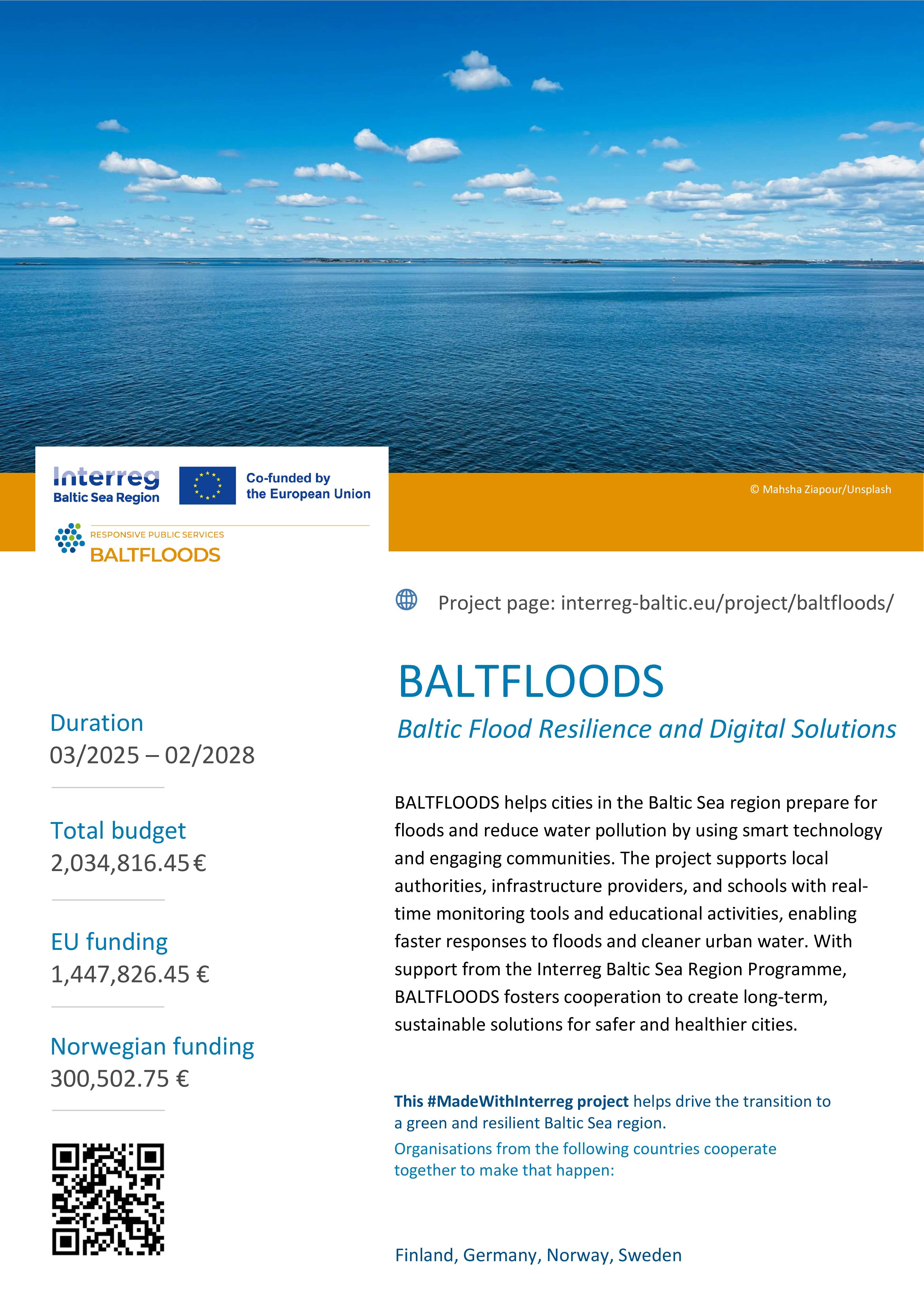BALTFLOODS (Baltic Flood Resilience and Digital Solutions), a groundbreaking initiative co-funded by European Union, under Interreg Baltic Sea Region Programme has officially commenced. BALTFLOODS aims to enhance flood preparedness and mitigate runoff pollution in cities across the Baltic Sea region by leveraging digital and technological solutions and engaging citizens as key stakeholders.