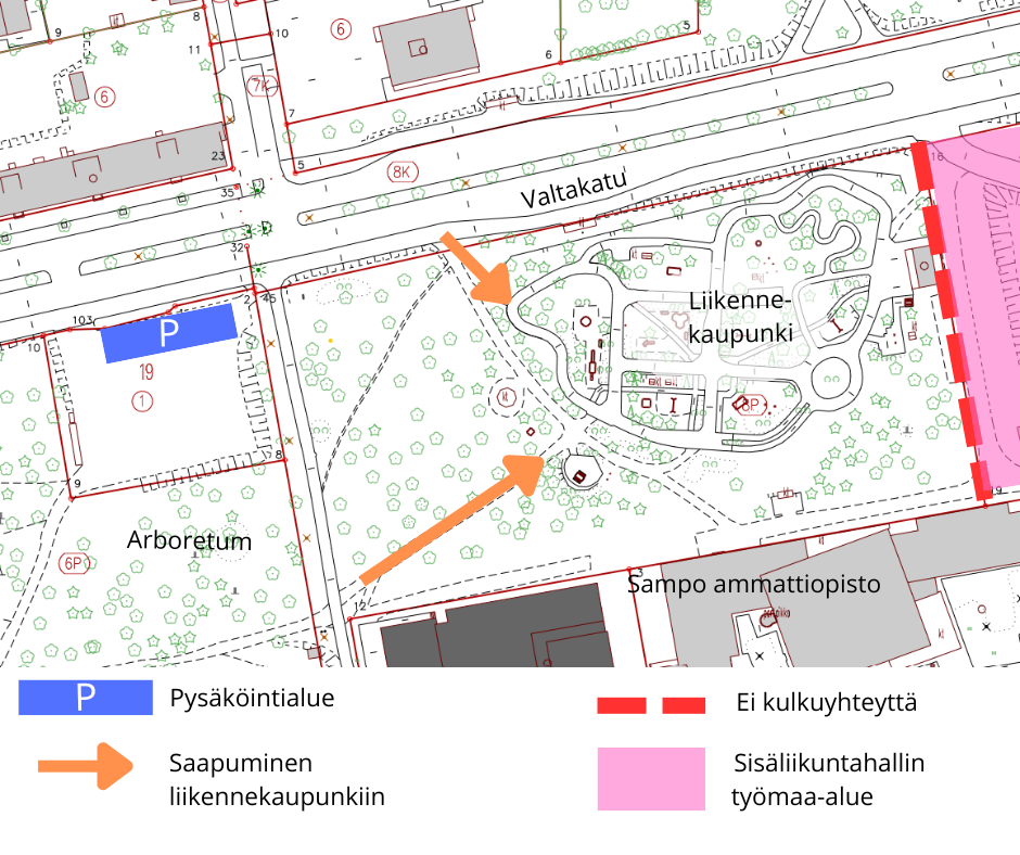 Liikennekaupungin itäpuolella käynnissä olevan sisäliikuntahallin työmaan vuoksi, sisäänkäynti ja pysäköintipaikat liikennekaupungin itäpuolella ovat pois käytöstä vuonna 2025. Liikennekaupunkiin saapuminen tapahtuu alueen länsipuolelta. Korvaava pysäköintipaikka löytyy liikennekaupungin länsipuolella olevalta hiekkapintaiselta pysäköintialueelta. Tilapäiset järjestelyt on esitetty alla olevalla kartalla.