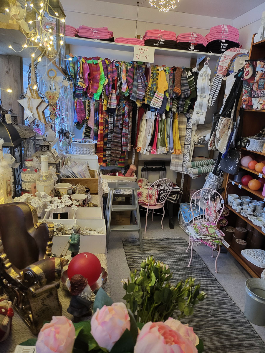 Omin käsin neulottuja villasukkia ym. ja käytettyjä astioita ja koriste-esineitä.
