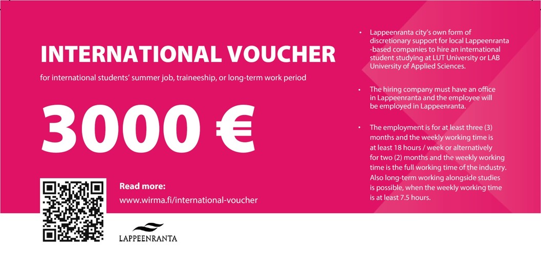 The International Voucher is City of Lappeenranta's own form of discretionary support for companies in Lappeenranta for hiring students studying at LUT University and LAB University of Applied Sciences.
